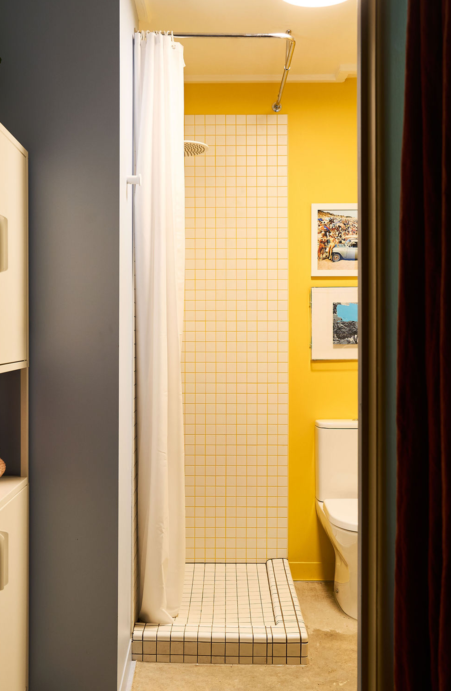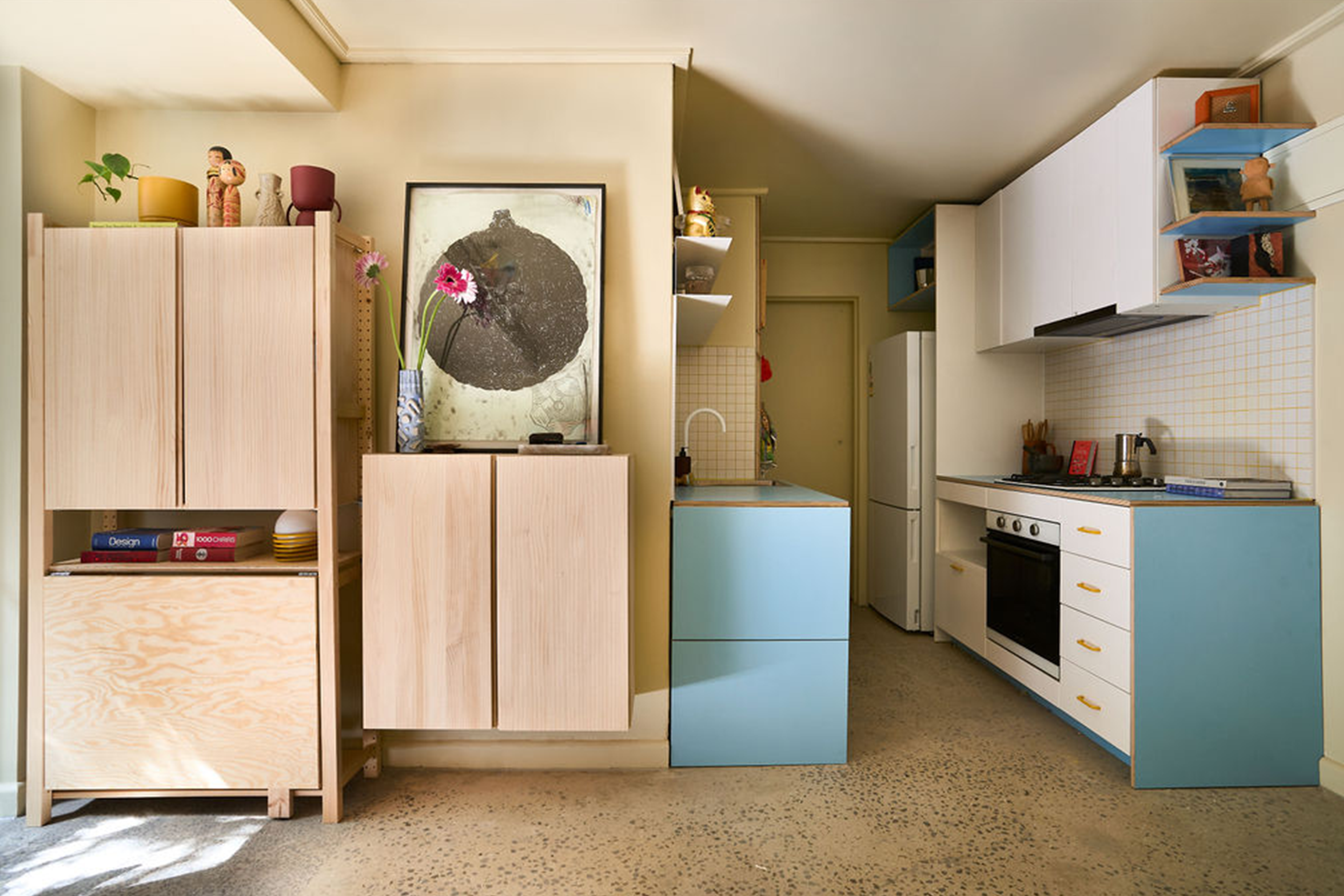 Material decisions were guided by restraint and continuity. The existing floor was removed to reveal and polish the concrete slab, extending throughout the apartment and into the bathroom to create a unified base. A deliberate use of colour defines each zone, responding to the client’s creative brief and reinforcing a sense of identity within the compact layout.