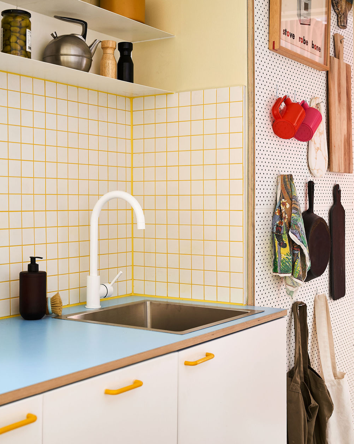 A concealed desk folds into a compact cabinet, while a series of curtain-lined zones soften the apartment and allow spaces to open and close as needed — including a bedroom enclosure that replaces traditional wardrobe doors. In the kitchen, layered elements such as a pegboard wall and a fold-out work surface expand functionality without increasing footprint.