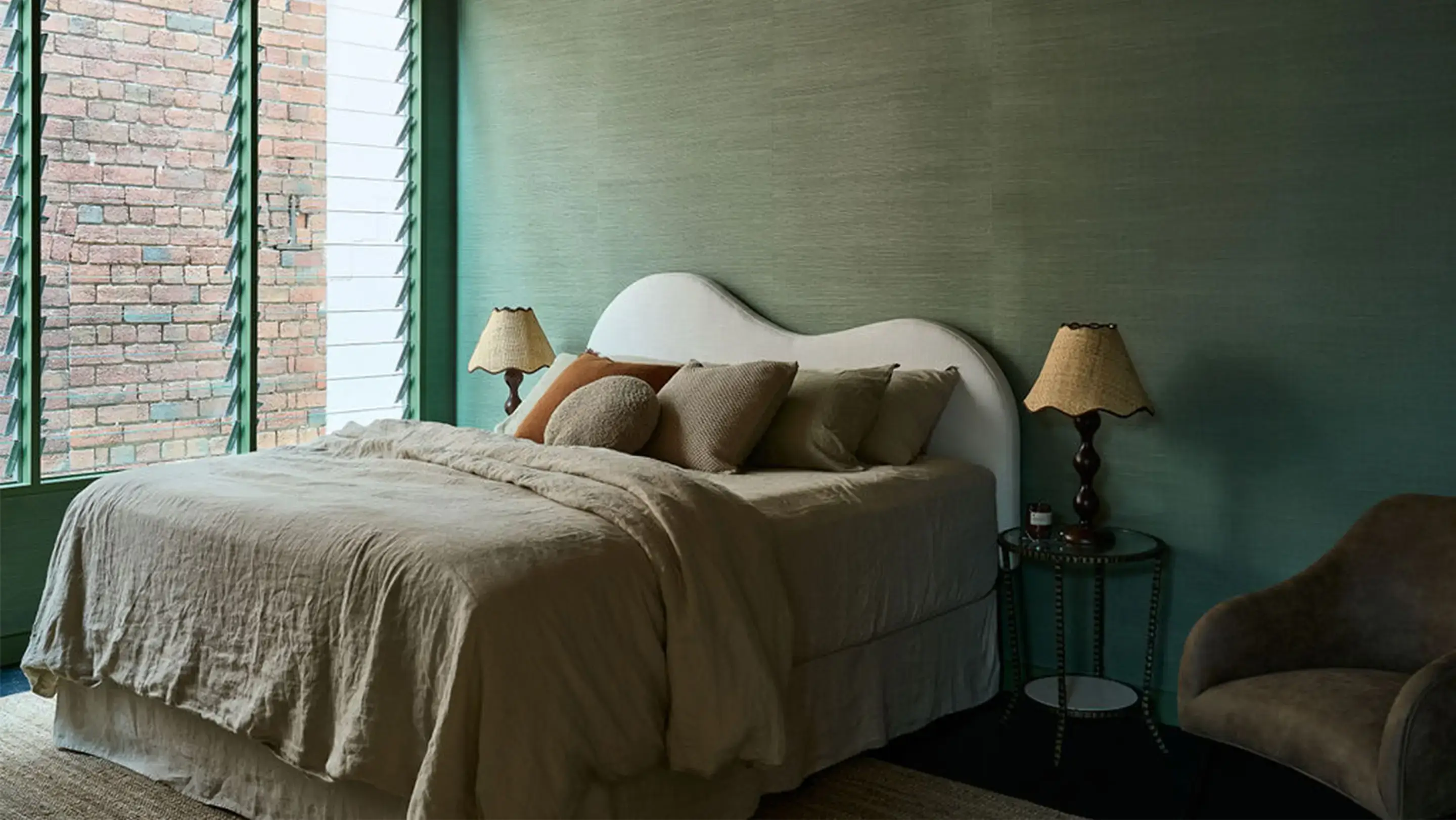 A dream warehouse makeover with dream clients to boot. As stage one of this renovation, we are working our way from the roof to the kitchen, with a pit-stop in the master bedroom and ensuite. As lovers of mid-century design, the clients encouraged us to lean into the tones and textures of the period while giving a nod to the home’s industrial roots. Drawing inspiration from the exposed brick and original lining board ceilings, we used a mixture of terracotta-toned tiles in the ensuite and applied lining boards to the pitched ceiling. Olive green grasscloth wallpaper in the bedroom provides a great backdrop to an eclectic mix of furniture and textiles.